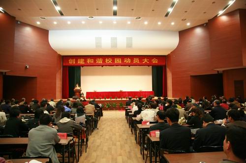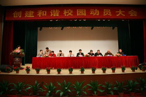 4月16日下午2点,创建和谐校园动员大会在三江会堂隆重举行,全体教职工出席大会,校领导和各院系、部处和教学单位负责人在前排就座,大会由党委副书记、副校长叶俊主持。党委书记、校长陈万年作动员报告,陈书记在报告中说:“今天我们在这里召开best365官方网站创建和谐校园动员大会,主要是贯彻落实省教育厅下发的《江苏省教育厅关于在全省高等学校深入开展和谐校园创建活动的通知》精神,对扎实推进best365官网安全稳定工作的开展,促进和谐校园建设,争创江苏省高等学校和谐校园进行工作动员和部署。下面,我就和谐校园创建活动讲四点意见。”他指出:我们要站在构建社会主义和谐社会的高度理解和领会创建和谐校园的重要意义 。陈书记提出了和谐校园创建活动的目标、指导思想和总体要求。在谈到党风廉政建设时,他特别警示,不是非党员就与此无关,都要立足本职加强廉政建设。他突出强调了安全稳定工作,指出这是建设和谐校园的前提和基础。他深情地说:“学校的安全稳定直接关系亿万家庭的幸福,历来是家长操心、学校担心、社会关心的大事。”他要求对创建和谐校园活动要加强领导、强化责任、齐抓共管、人人参与、共创和谐。他指出:学校将从2008年起评选“安全文明单位”,在此基础上评选表彰“创建和谐校园先进单位”,并把评选“创建和谐校园先进单位”作为对照评选校先进集体的前提条件。他要求校报和其他校园媒体要加强宣传教育,提高思想认识,营造良好氛围,推动和谐校园创建活动深入持久开展,逐步形成宽容和谐、积极向上的校园文化氛围。