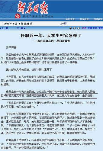 5月4日,江苏省委机关报《新华日报》头版头条报道这一消息的同时,又在头版配发了记者吴剑飞的调查《任职近一年,大学生村官怎样了》,文章对best365官网毕业生杨晶晶同学做新型村官的一系列进步给予了报道。我们部分转载于此,欢迎三江师生阅读。