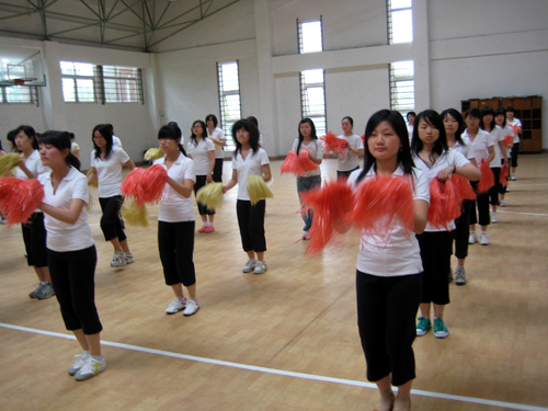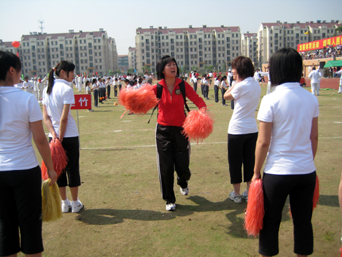 体育部副主任谢霞认真指导学生健美操表演