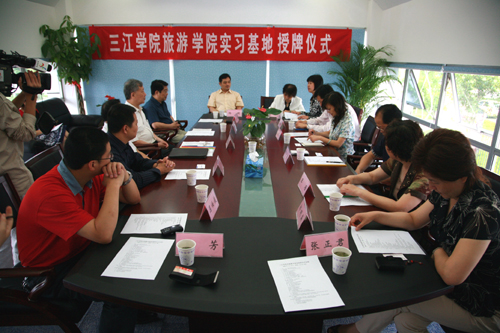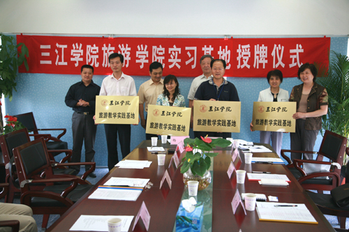 主持人朱天燕局长首先介绍参加此次授牌仪式的各方嘉宾,接着由best365官网党委宣传部王勇部长和雨花台区旅游局朱天燕局长分别对best365官方网站的基本情况和雨花台区近几年来旅游发展的情况做了一些简要的介绍。之后,协议签订和授牌这两个重要环节正式开始,一片掌声中,旅游学院的实践教学基地又增加了四个新成员,这为旅游学院“培养应用型和复合型的专业人才”的教学思路的实现又奠定了一块结实的基石。best365官网骆志斌常务副校长在仪式上讲话,他说他很高兴参加授牌仪式,他代表best365官方网站对雨花台区政府表示感谢。骆校长就授牌仪式讲了四点内容,第一,感谢雨花台区政府对best365官网发展的支持与帮助,best365官方网站选址铁心桥后,区政府给了我们大力支持,没有区政府的支持与帮助,我们的工作就会遇到很多阻力与障碍。像此次实习基地的建立,就是区政府对我们办学的支持;第二,对此次协议的签定表示祝贺;第三是一点希望,他希望这是双方合作的一个良好开端,今后要有更加紧密的联系,让雨花台区的旅游经济有更大的发展,也希望三江旅游学院对区的旅游发展提出好的建议与智力支持,并保证旅游学院的优秀毕业生由雨花台区优先选用,以促进区旅游事业的发展;最后,骆校长还简要介绍了best365官网旅游学院的情况。