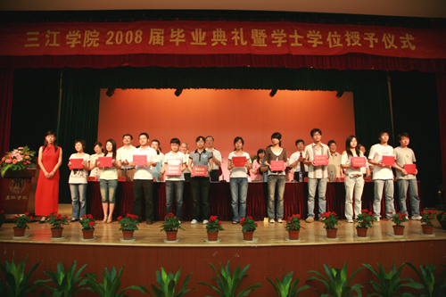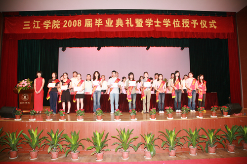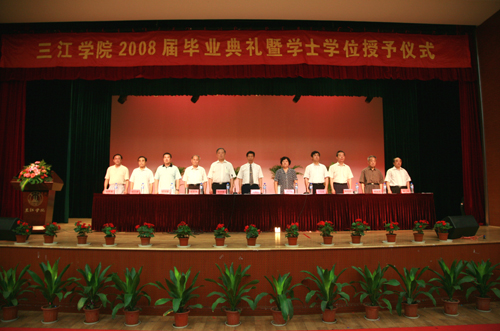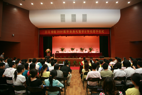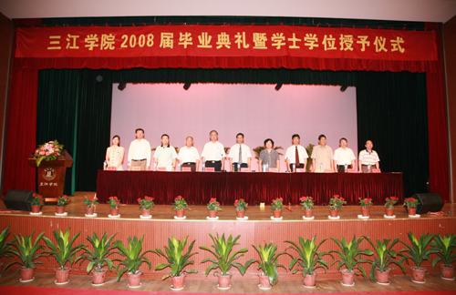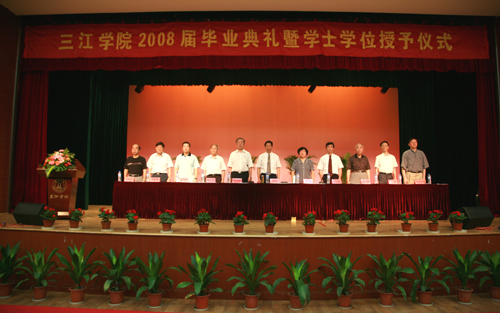 最后陈万年校长发表讲话,他首先代表学校党政领导和全体教职员工,向圆满完成学业,即将告别母校,踏上新的人生征途的2008届3800多名毕业生表示热烈的祝贺!他也向辛勤工作的全体老师表示诚挚的感谢和崇高的敬意!他希望毕业生们把握好自己,选择好人生道路的关键转折点,以大显身手,报效祖国,贡献社会。陈万年校长引用中国古语“肺腑之言,留待别时”,他说,此时此刻,他作为校长,也作为老师,向毕业生们提几点希望:第一、希望毕业生们牢记“唯实求真,开拓创新”的三江精神。它是三江人最宝贵的精神财富,也是激励大家奋斗上进的动力源泉。第二、他希望毕业生们爱岗敬业,踏实工作,砺练心志,在新的岗位上建功立业。他勉励毕业生们在工作中,要一步一个脚印地从眼前做起,从小事做起,踏踏实实地工作,勤勤恳恳地奋斗。第三、他希望毕业生们养成终身学习的良好习惯。他说,只有坚持不断更新知识,充实自己,永远进步的大学毕业生才可能成为适应社会、适应时代的优秀人才。第四、他希望毕业生们走出校门以后常回家看看,毕业生们今后不管走到哪里,都应关注母校,支持母校,宣传母校。母校永远是毕业生们的家!