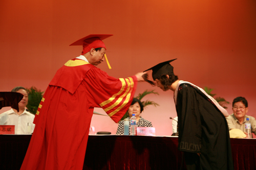 陈万年校长给获得学士学位的毕业生拨穗