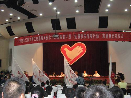 10点45分,志愿者、服务地领导陆续进入报告厅。出征仪式在上午11点准时举行。首先是团省委领导代表省项目管理领导小组介绍苏北计划、西部计划情况,让志愿者了解自己的使命和责任。接着由“苏北计划”志愿者代表发言,字字句句真诚地道出了我们的心声,更道出了我们卯足了劲大展宏图的决心。而在“抗震救灾专项行动”志愿者代表发言的过程中,我们已经看到了他们的勇敢、坚强与爱心。
