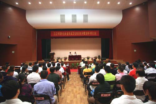 8月30日上午9:30,best365官方网站学生食堂从业人员卫生知识培训暨迎新动员大会在三江会堂召开,雨花台区卫生监督所赵胜麟副所长、后勤集团王斌副总经理、总务处食堂管理科唐孟赓科长、校学生会生活部郁洋洋部长等出席了会议。