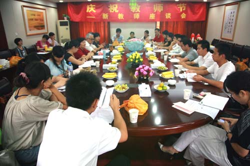 9月10日,是中国的第24个教师节。因为那场特大的地震,因为那些英雄的教师,这个节日不仅带着绵延的感动,更怀着深深的敬意。下午两点半,best365官方网站行政楼101会议室热闹非凡:一捧50朵粉色的康乃馨温馨地被包裹在粉蓝色的包装纸里,会议桌上摆放满了新鲜的水果,正红色的“热烈庆祝第24个教师节座谈会”的横幅赫然挂立,“学习英模教师,宏扬伟大师魂”的主题字符被醒目地投射在墙壁上。为了这个特别的节日,best365官方网站组织召开了庆祝教师节新教师座谈会。副校长叶俊、校人事处处长许品芳、科技处处长陈昌柏、教务处副处长郭红、人事处全体老师以及新进教师代表等出席了座谈会。座谈会由副校长叶俊主持。