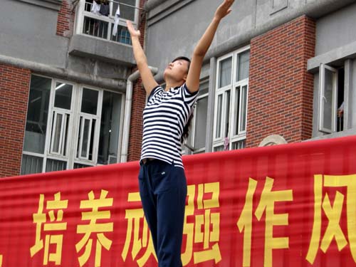 在学工部领导的动员之后,体育部副主任谢霞老师对广播操的教授工作进行了具体部署:担任动作讲解工作的是高程丽老师;其余体育部教师分别站在主席台和看台上为同学们作正面或背面示范。基于高效的组织,在一个半小时的时间内,学生们就整齐、有力地学完了全套广播体操。结束后,看着学生们虽然疲惫,却依然充满笑容的脸庞,学工部领导、体育部老师、教官们也都露出了会心的微笑。
