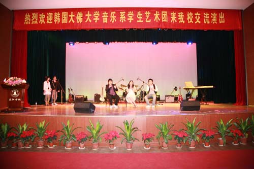 2008年10月20日晚,韩国大佛大学音乐系学生艺术团在三江会堂席卷起一场火爆韩风。韩国大佛大学校长李升勋,三江大学校长、党委书记陈万年教授和多位教授出席了晚会。陈万年校长致词,欢迎远道而来的大佛大学领导和同学,希望这次交流成为双方增进友谊的桥梁。