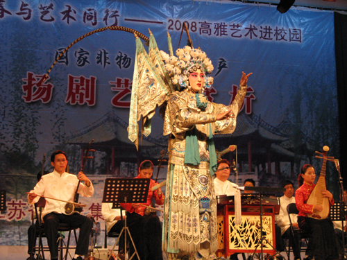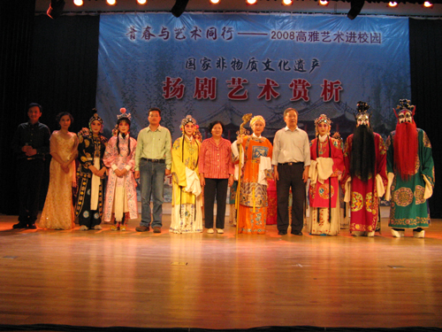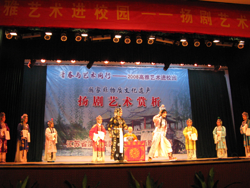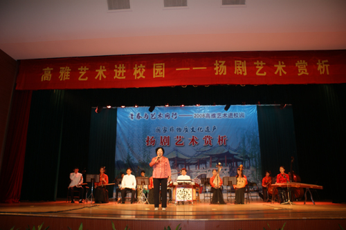 赏析演出在叶俊副校长的精彩致词后拉开了序幕。国家一级演员、影视剧三栖明星侯长荣和国家二级演员诸葛秀兰担任主持。首先是民乐合奏《扬州好》和扬剧曲牌曲目协奏,其中有高胡、二胡、中胡、笛子、笙、扬琴、古筝、琵琶、大提琴和木鱼十种乐器合奏,为本场赏析演出奏响了第一曲。出演此次赏析演出的可谓群英荟萃,其中有国家一级演员袁晓君、国家二级演员汪晓燕、马晓祥、李霞等,他们分别献演了扬剧经典唱段《断太后》、《珍珠塔·方卿羞姑》、《百岁挂帅·登高丘》等;随后演员与学生的精彩互动充分调动了现场的气氛,也进一步加深了广大同学对传统艺术的兴趣。国家一级演员、梅花奖获得者徐秀芳携众演员演出的大型经典扬剧《百岁挂帅》选场将赏析演出推向了高潮。演出结束之时,全场观众报以热烈的掌声。最后,校领导上台与众演员合影留念。
