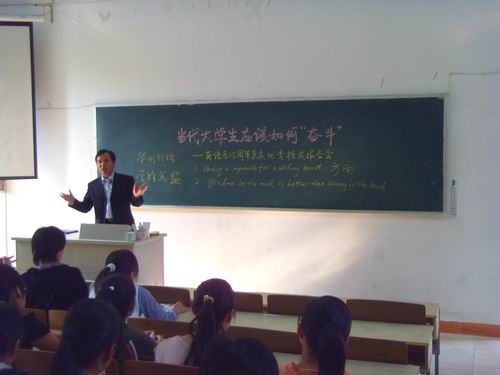 系庆系列活动的另一个重要组成部分是由杰出校友——04届毕业生唐安蔚先生给英语系在校学生作讲座。讲座题为《当代大学生应该如何奋斗》。唐安蔚先生从best365官方网站毕业后,经过短短几年的奋斗,已成为地产界小有名气的人物,并且是全国十佳房地产策划人之一。他结合自己的亲身经历,生动地讲述了大学生如何才能在这个竞争激烈的社会立于不败之地。在座的同学都为他的成功所折服。他从不曾满足于课本知识,离开大学后他仍不断用更多的知识来充实自己。他深信所有人都是平凡的,所有人一开始都是站在同一条起跑线上,决定谁跑得更久更远的只在于他的付出。“只有付出更多,才能收获更多。”这是他送给在场每一位学生的话。相信这句话会鼓舞每一位听众用付出通往成功之路。