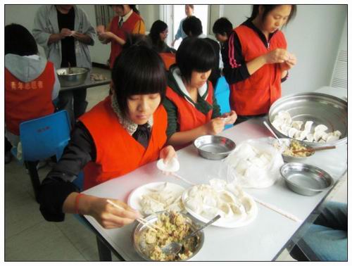 大家一到就忙活起来, 敬老院院长把志愿者们领到了厨房后,同学们就开始洗大白菜、拣韭菜、挑芹菜,很快忙乎了起来。将近中午时,厨房那张大桌子就摆满了大家包的饺子,老爷爷老奶奶都被志愿者们陆续带到了餐厅,老人们吃着饺子,脸上都露出了开心的笑容。