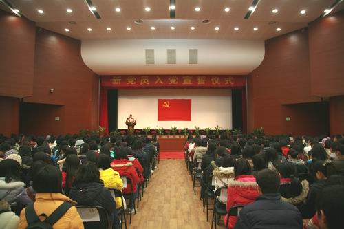 宣誓仪式在国际歌声中拉开序幕,参加宣誓的新党员列队面向党旗,举右手齐肩握拳,在校党委书记、校长陈万年带领下进行了庄严宣誓。