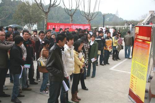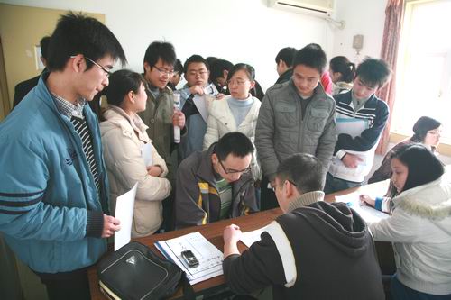 (同学们早早就在老行政楼外守候,了解招聘单位信息)