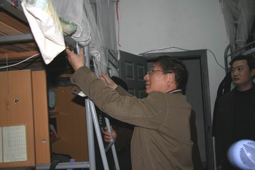 (董新华副校长牵挂同学们的安全,细心床螺丝的松动,嘱咐管理人员及时改进)