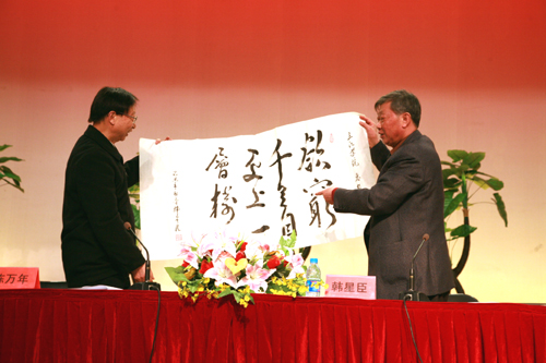 (韩星臣教授赠送书法作品与三江领导、师生共勉)