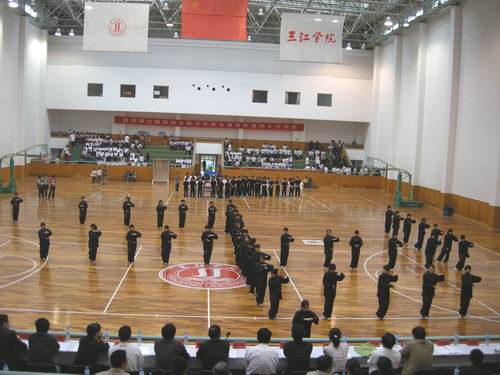 紧接着比赛开始。在悠扬的《茉莉花》音乐声中法律系首先为集体项目比赛点燃了气氛,之后文学院的表演将比赛推向了高潮。各院(系)用队形、服装、音乐等生动形象地表达了对太极拳的理解,赢得了现场观众阵阵的掌声。同时,健美操馆和武术馆也在分别紧张激烈地进行着小组项目和个人项目的比赛。