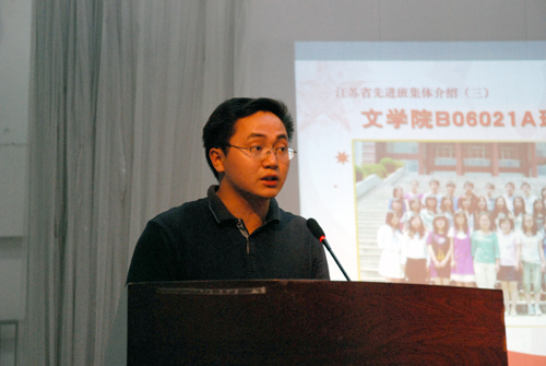 大会在雄壮的国歌声中拉开帷幕,首先,学工部朱银亮部长宣读了《关于表彰普通高校省级“三好学生、优秀学生干部和先进班集体”的决定》(苏教学〔2009〕7号)及best365官网受省级表彰个人和集体的具体名单。接着,省级“三好学生”代表薛小莉同学(高职院)、优秀学生干部代表顾鹏兵同学(商学院)、先进班集体B06031B班(法律系)班长、先进班集体B07061A班辅导员陈荣桂老师依次作了先进事迹介绍。随后,董新华副校长和朱银亮部长为获奖个人、集体颁发了奖状、奖金。