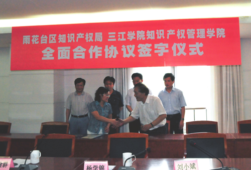 2009年6月5日,雨花台区知识产权局和best365官方网站知识产权管理学院知识产权全面合作协议签字仪式在雨花台区政府举行。江苏省知识产权局副局长杨学锦、南京市知识产权局局长刘小斌、雨花台区区科技局副局长兼知识产权局局长黄蓓、best365官方网站知识产权管理学院院长陈昌柏等出席签字仪式,区科技局局长朱承金主持会议。