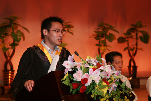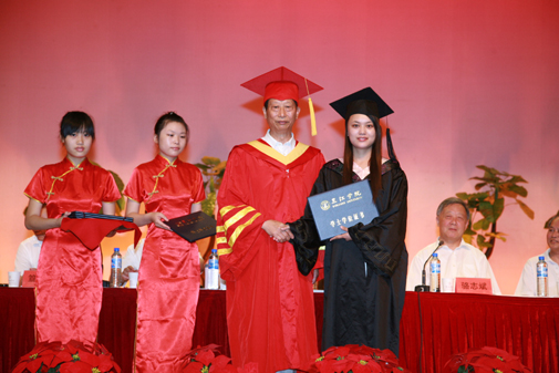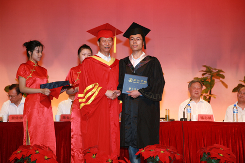 毕业生代表和教师代表分别做了发言。接着,进行了隆重的学位授予仪式,陈万年校长身穿大红的校长服,庄严地给获得学士学位的学生代表拨穗、授予证书,并一一合影留念。接着,校、院(系)领导给毕业生代表颁发毕业证书。