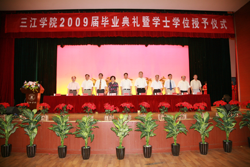最后陈万年校长发表讲话,他代表学校理事会、校长、校党委和全校17000多名师生员工,向圆满完成学业,即将告别母校,踏上新的人生征途的2009届近4100名毕业生表示热烈的祝贺!借此机会,他也要向辛勤工作、悉心培养你们的全体老师表示诚挚的感谢和崇高的敬意!他希望毕业生们把握好自己,选择好人生道路的关键转折点,以大显身手,报效祖国,贡献社会。陈万年校长引用中国古语“肺腑之言,留待别时”,他说,此时此刻,他作为校长,也作为一位从事教育工作近50年的老师,向同学们提几点希望,与毕业生们共勉:第一、希望毕业生们牢记“唯实求真,开拓创新”的三江精神。它是三江人最宝贵的精神财富,也是激励大家奋斗上进的动力源泉。第二、他希望毕业生们爱岗敬业,踏实工作,砺练心志,在新的岗位上建功立业。他勉励毕业生们在工作中,要一步一个脚印地从眼前做起,从小事做起,踏踏实实地工作,勤勤恳恳地奋斗。第三、他希望毕业生们养成终身学习的良好习惯。他说,只有坚持不断更新知识,充实自己,永远进步的大学毕业生才可能成为适应社会、适应时代的优秀人才。第四、他希望毕业生们走出校门以后常回家看看,毕业生们今后不管走到哪里,都应关注母校,支持母校,宣传母校。欢迎毕业生们经常回家走一走,看一看。母校将永远惦念着毕业生,关注着毕业生,期待着毕业生!母校永远是毕业生们的家!
