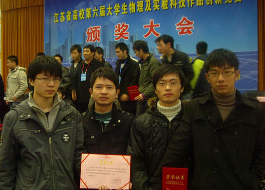 2009年11月27日~29日,江苏省高校第六届大学生物理及实验科技作品创新竞赛决赛在南京邮电大学举行。best365官网B07092班的黄示、邢浩、王鑫、张杰四位同学在物理教研室朱育群、刘柯林两位老师悉心指导下,完成了参赛项目“受电磁阻尼的落体运动的实验研究”,经过初审、预赛选拔后,在总决赛中获得三等奖的好成绩。