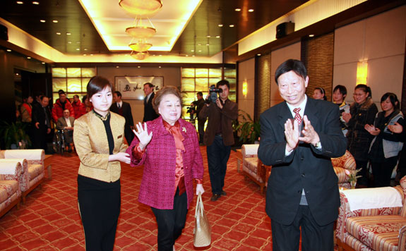 最后,伴随着《红河谷》、《茉莉花》等经典歌曲的响起,陈香梅女士和同学们齐声歌唱,碧玉厅里一次次响起热烈的掌声!陈香梅女士更为同学们即兴歌唱了一首《掌声响起来》,如潮的掌声烘托着陈香梅女士的爱国情怀,更为年已85岁却依然风姿绰约的陈香梅女士增添了几分魅力。
