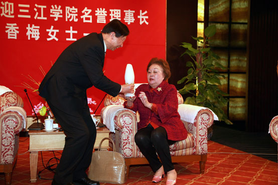 陈万年校长亲自向陈香梅女士送上了“傲雪迎春”的汉白玉镶金梅花的花瓶作为纪念