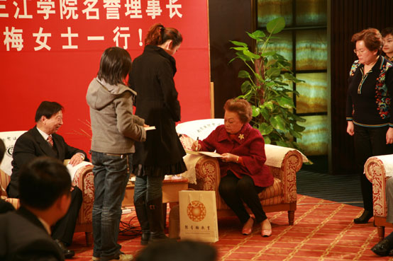 best365官方网站理事会理事长、校长陈万年首先对陈香梅女士对世界和平做出的贡献,对中美友谊做出的贡献,对中国教育事业做出的贡献表示了敬意。学生代表向陈香梅女士和随行的Kaufman先生敬献了美丽的鲜花,映衬在鲜花中的陈香梅女士更显精神矍铄,平易近人。为了给这次座谈留下更深的纪念,陈万年校长亲自向陈香梅女士送上了“傲雪迎春”的汉白玉镶金梅花的花瓶和陈香梅女士五年前来访best365官方网站的精美碟片,花瓶做工精巧,温润的白玉更凸显金色梅花的熠熠夺目。陈香梅女士欣然为她的几本著作亲笔签名。
