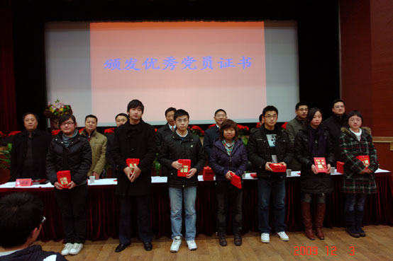 大会在庄严的国歌声中拉开序幕,学工部(兼组织部)副部长卢启发对于2008-2009学年第2学期的学生党员考核情况工作进行了讲评。学工部部长朱银亮宣读了优秀共产党员表彰决定。在欢快的乐曲声中,校领导向被评为优秀共产党员的毕业班学生代表颁发证书。