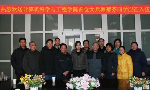 2009年12月21日下午,计算机科学与工程学院在一院会议室举行了欢送我院首位女兵韩菊芬同学应征入伍的仪式。副校长、我院院长王芝庆,学工部部长、人民武装部部长朱银亮,我院常务副院长叶传标,副院长王成均、佟振明,全体辅导员及韩菊芬家长参加了欢送仪式。欢送仪式由副院长郁政宏主持。