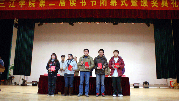 本届读书节从09年12月1日到12月29日,为期一个月。对丰富校园文化,提高学生素质,营造书香校园起到了一定的推动作用。闭幕式上,为本届读书节期间表现突出的院系和优秀个人给与表彰和奖励。首先颁发的是“读者之星”荣誉称号,此奖项是由图书馆在本校15000名读者中,根据09年年度内读者借书册数、借书类别等综合因素评选出的十位优秀读者。英语系的李霜同学和土木工程学院的尤仁飞同学分别发表了获奖感言。其次,为校园文化论坛的优秀会员、图书馆首届信息检索大赛的获奖单位、大学生读书会的优秀干部及优秀会员进行了表彰和奖励。