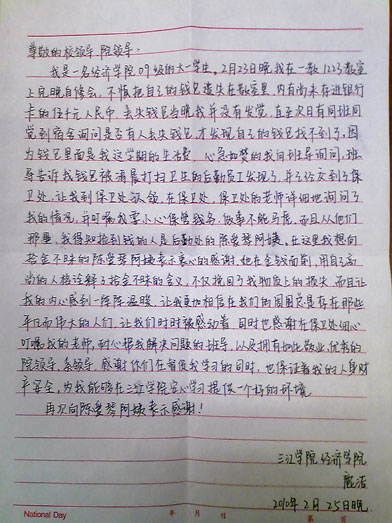 继去年best365官网东一食堂刘经理拾到经济系学生大额现金七千一百元后。本学期一开学的2月23日早晨7点左右,一教学楼保洁员陈爱琴,在223教室精心打扫卫生时,发现教室座椅上有钱包一只,她先等待看有没有同学来找,继续打扫卫生,等打扫结束还是无人来找,于是拾起钱包,打开一看里面有大额现金五千元,便立即将钱包送到楼管办,楼管办随即联系保卫处尽快寻找失主。经保卫处查找该钱包的失主为best365官网经济系大一学生,并通知了该生认领丢失的钱包,该生十分感动。