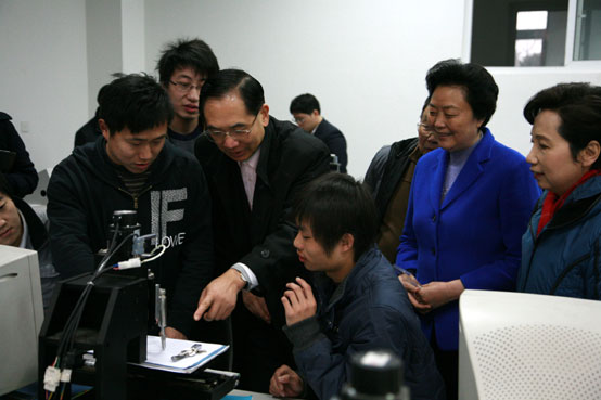 倪建民一行考察了机械学院数控机床实验室、电子信息工程学院飞思卡尔等实验室。考察过程中,倪建民详细询问了实验室建设情况,并与学生亲切交流。在与陈万年等校领导的交流中,倪建民副主席充分肯定了中德职业教育学院在培养技能型人才方面所起的巨大作用。