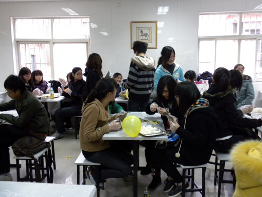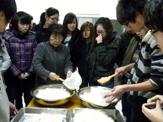 外教老师和同学们首先进行了原材料的加工和分配,分发完原材料与工具,曾田和久崎老师开始带领大家制作寿司,制作过程包括在竹排上铺上海苔、铺寿司米、摆放原材料、卷寿司以及切寿司五个过程,每个过程的制作都非常精细讲究,外教娴熟的技艺和优美的姿态也赢得了同学们的惊叹和赞美。制作示范之后便是同学们自己进行制作了,大家分工明确,互相合作,有的人在摆放原料、有的人在卷寿司、还有的人在细细的切片,一时间,欢声笑语不断…….做出来的寿司有的又胖又圆、有的精致小巧、甚至有的还是方形的,切好后更是奇形怪状,有圆有缺…….尽管同学们做出的寿司形态各异,但大家还是很开心地与外教一起享用了这些美食。在大家欢声笑语里结束了寿司制作活动。