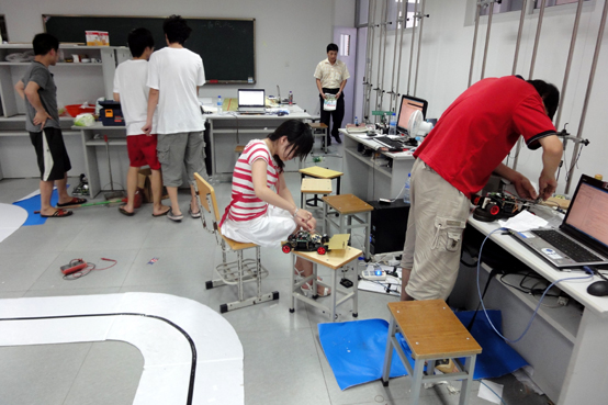 电子学院飞思卡尔智能车竞赛参赛学生正准备调试竞赛用车