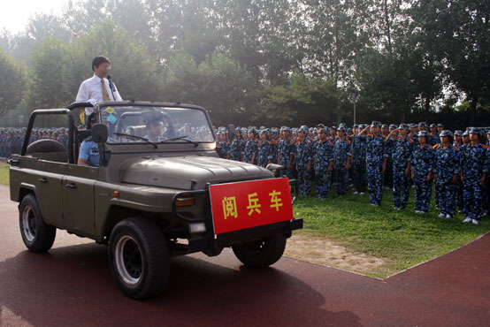 陈万年校长登上阅兵车绕场一周向同学们致以亲切的问候