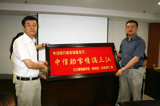 接着,受助的两名学生代表汇报了自己的家庭情况和在获得2010年中信爱心助学金后的各方面表现,表示一定要树立关爱社会、无私奉献的品格,努力以自己的实际行动来回报社会;best365官方网站校长助理、高职院(继教院)院长郭彬向中信银行南京城南支行赠送了“中信助学、情满三江”的牌匾,表达了我院两千多名师生对中信银行南京城南支行员工们高尚爱心的感谢之情。