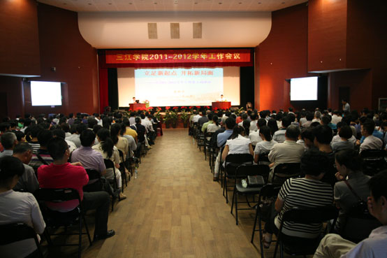 经过两个半天的休会,25日下午2点,学年工作会议继续在三江会堂召开,理事会理事长、党委书记陈万年同志主持,全体教职工出席大会。董新华校长就新学年工作要点做题为《立足新起点 开拓新局面》的报告。报告开始前,董校长宣读了周更生副校长的任命文件、成立东校区管委会的文件、郭彬同志任东校区管委会主任的文件。随后他提议,为暑期依然战斗在招生、教务、学生第二课堂活动及各类大赛培训、行政、图书馆、后勤等第一线的教职工表示衷心的感谢。