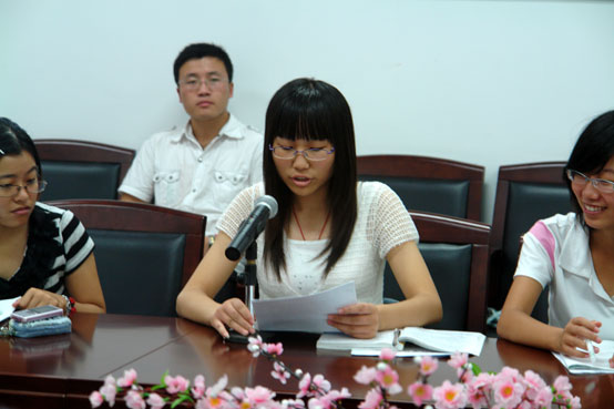会议伊始,商学院副院长张燕代表学院介绍了本院暑期社会实践组织的基本情况:一是继续与“产学研”基地宜兴张渚镇人民政府联系,安排6名学生在该镇的宇杰钢机进行为期2周的顶岗实习;二是与实践教学基地宏图三胞高科有限公司联系,安排学生在其南京及苏中、苏北等地的15家门店进行为期一个月的顶岗实习;三是组织两个大学生创新项目《江苏省农村物流基础设施现状调查》和《江苏省农村发展低碳经济现状调查》课题组赴宜兴张渚镇进行调研活动。总的来说,效果优良,参加实践的学生受到了用人单位的一致好评,参加课题调研的学生也完成了预期的调研目标。随后,财务管理专业的胡婷婷、工商管理专业的杜宇、物流管理专业的王浩和市场营销(商务管理方向)的时朝言等同学分别代表不同的实践项目,作了汇报发言。娓娓道来的叙述、各富个性的心得体会,夹杂着些许人生的感悟,每位同学的发言都赢得了与会人员的阵阵掌声。